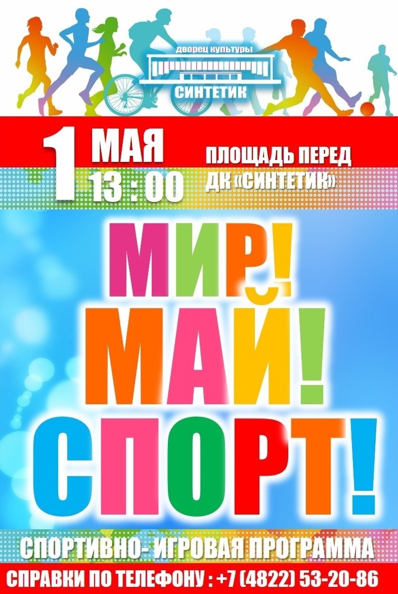 Дорогие друзья, дворец культуры «Синтетик» приглашает всех желающих посетить спортивно- игровую программу- «МИР! МАЙ! СПОРТ!», которая пройдёт 1 мая в 13: 00 на площади перед нашим ДК, сразу после концертной программы «Весенние настроение»!